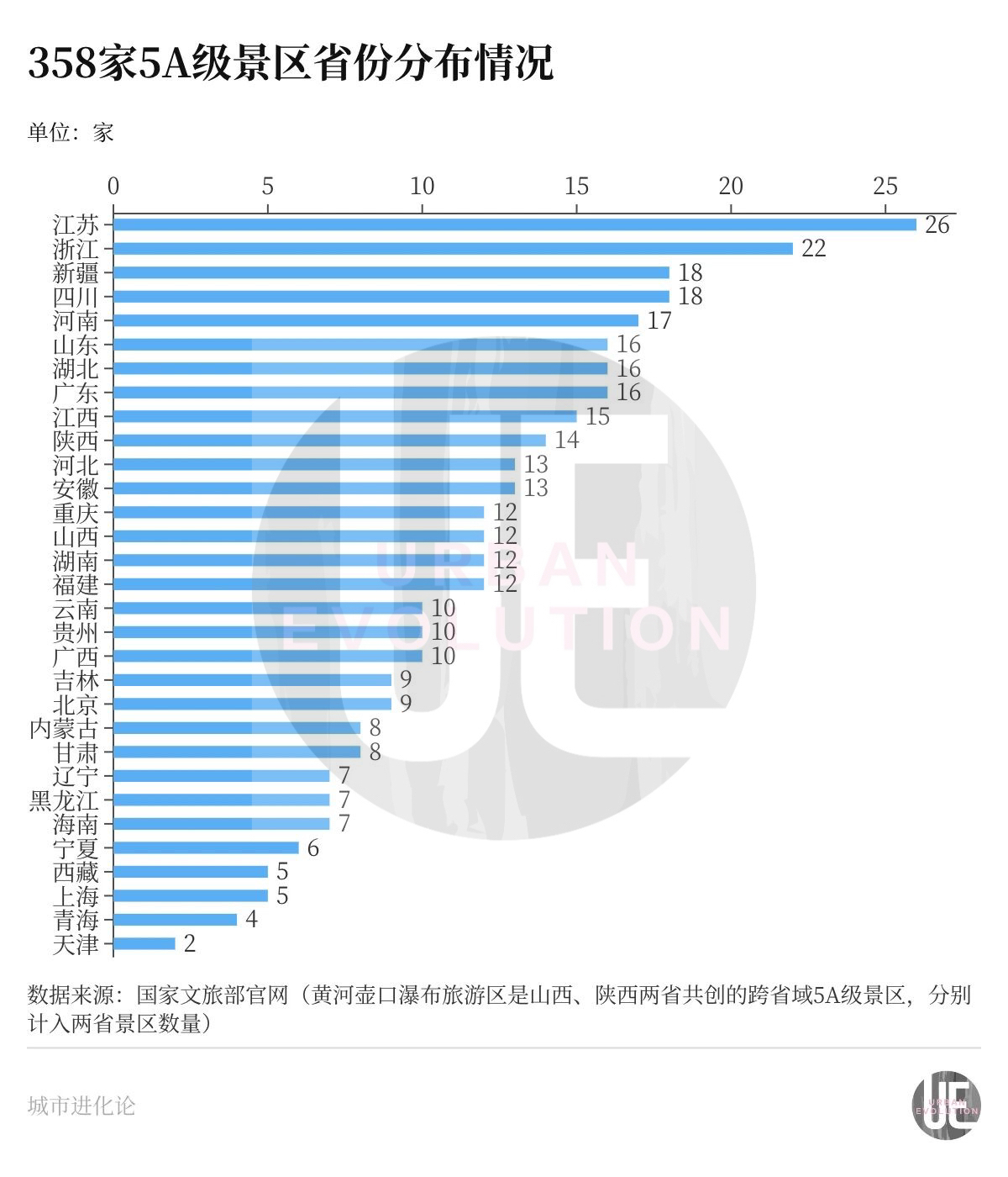 从地区分布来看,江苏以26家5A景区,位居全国31省份之首,浙江、新疆/四川(并列),分别以22家、18家5A景区数量,排名二、三位。